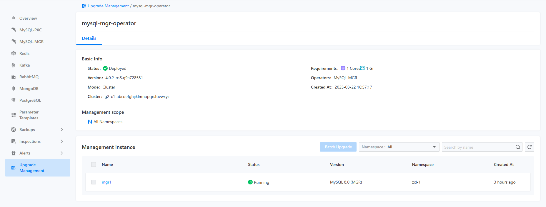 When users want to upgrade an instance, they can select the desired instance from the instance list and then click on the batch upgrade button in the upper right corner to trigger the rolling update for the corresponding instance. Users will observe that the status of the selected instances will sequentially change to Progressing. Once the instance update is completed, the status will change back to Running.