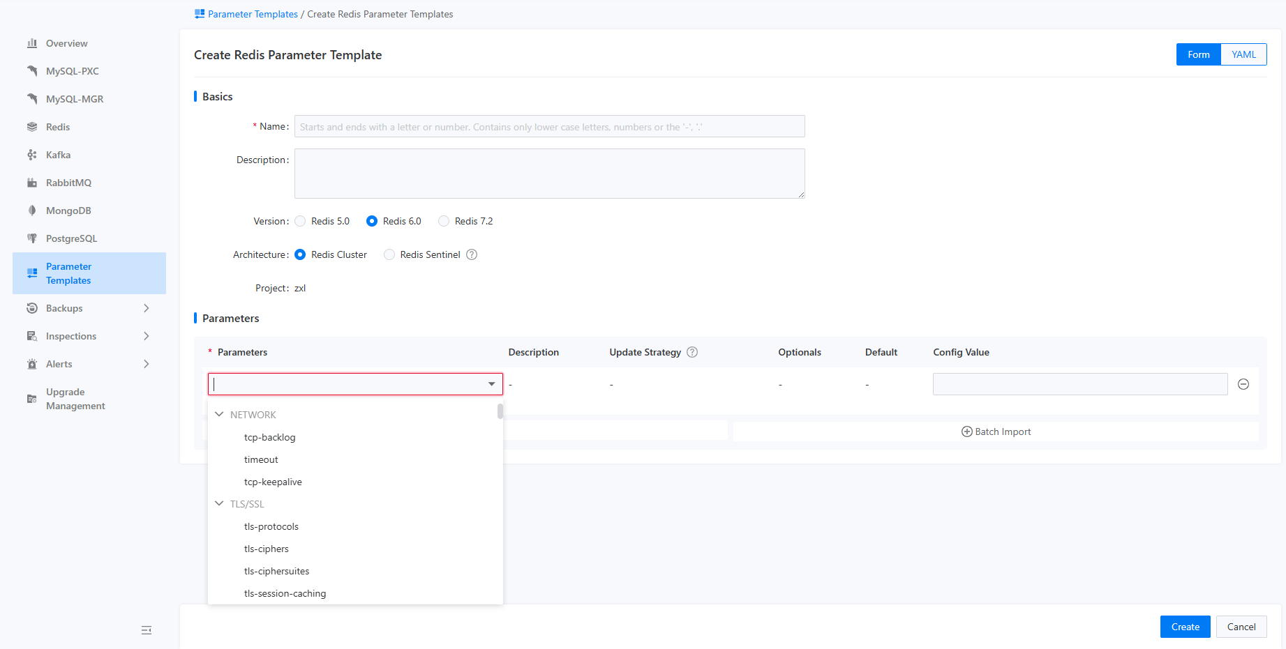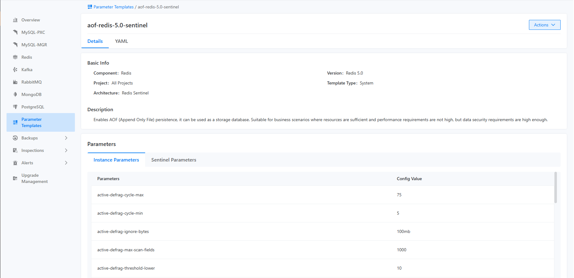 The parameter template feature is designed for the unified management and maintenance of parameter sets for various components. This includes viewing which parameters are included in the parameter templates, along with their default values and descriptions. Currently, the components that support parameter templates are MySQL (including PXC and MGR), Redis, and Kafka. The platform comes with pre-configured parameter templates for different scenarios and component specifications, representing industry best practices for use in those scenarios, thus allowing users to utilize them directly. Additionally, users can create custom parameter templates based on their specific business needs, facilitating internal standards implementation. All parameter templates can be selected for use when creating instances.