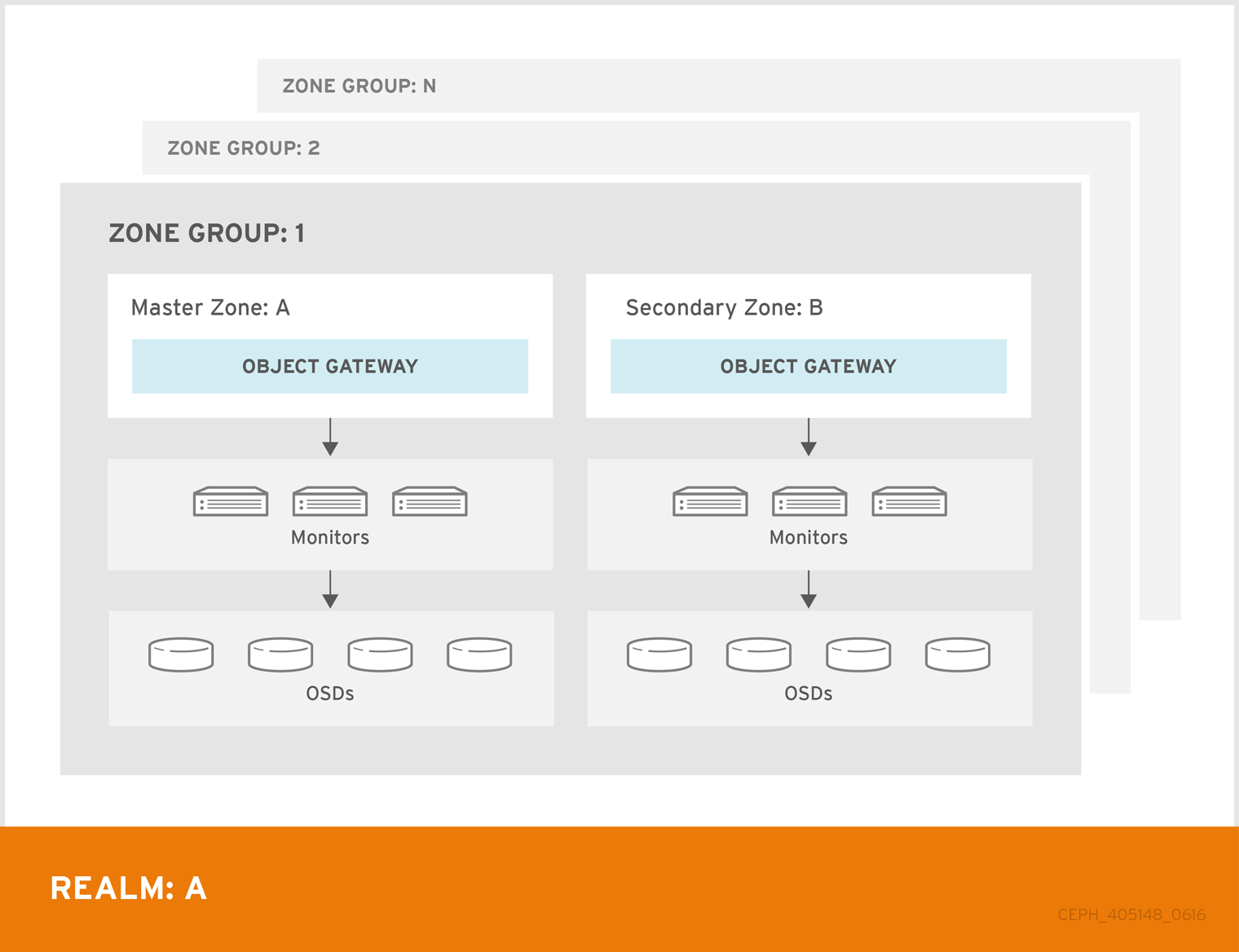 • Realm: The highest-level logical grouping in Ceph object storage. It represents a complete object storage namespace, typically used for multi-site replication and synchronization. A Realm can span different geographical locations or data centers.